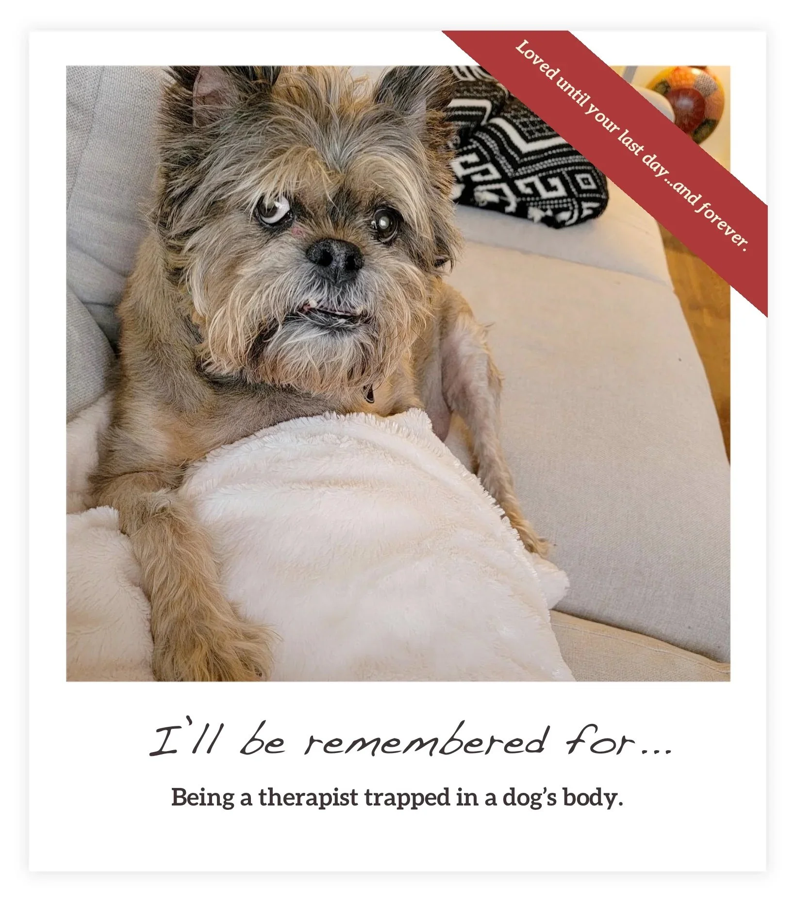 Mugzee’s mom's favorite thing that she will always cherish about this magnificent dog is that he always knew her moods, and he would actively manage her through his behavior. I swear, if he were a human, he would have been the best therapist in the entire world. We all will miss his giant underbite, his crazy walk, and his messy beard.